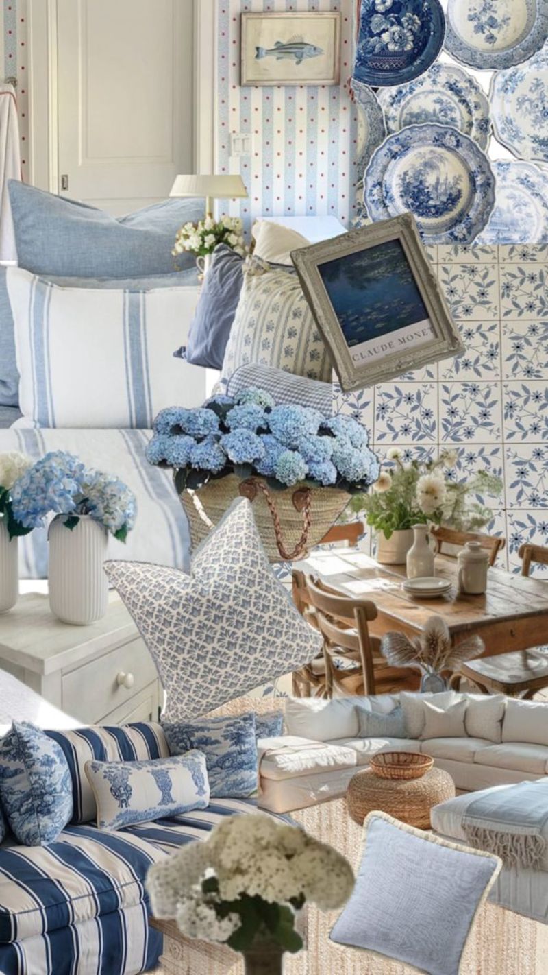 Your living room is where this aesthetic really shines. Start with a neutral slipcovered sofa (yes, the kind you can sink into while sipping iced Chardonnay). Add rattan accent chairs, a woven coffee table, and cozy throw blankets in muted blues. Keep windows light and airy with sheer curtains, and finish with nautical touches like seashell bowls or coastal artwork for subtle character.