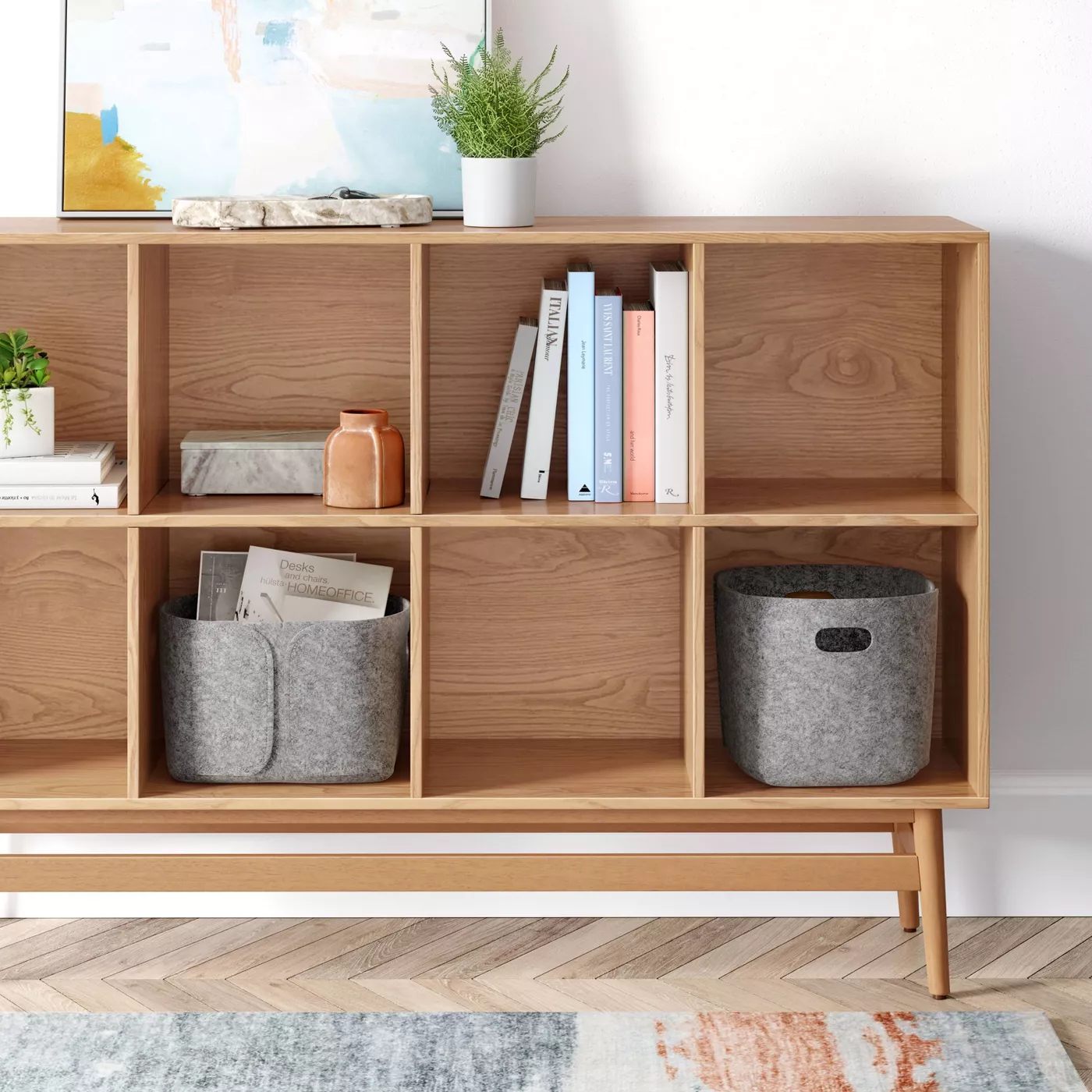 For example, imagine using a classic cube storage center and turn it into a media center by placing the TV on top. Adding a lamp, some decor, and decorative baskets can help keep everything organized and pretty. But, this space is also functional and valuable without taking up additional space. Try to find something with legs, like this Ellwood Cube Storage bookshelf from Target, so you can still get that media console look and feel.